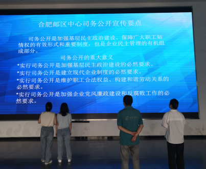 近期,根據(jù)安徽省郵政工會工作部署,合肥郵區(qū)中心局工會通過生產(chǎn)場地電子顯示屏播放司務(wù)公開宣傳要點(diǎn),并通過工會工作群組織學(xué)習(xí)集團(tuán)公司黨組《關(guān)于進(jìn)一步規(guī)范和加強(qiáng)郵政企業(yè)司務(wù)公開工作的指導(dǎo)意見》文件精神,并下發(fā)司務(wù)公開宣傳教育材料,要求中心各級工會組織積極開展涉及企業(yè)民主管理、司務(wù)公開相關(guān)文件精神和業(yè)務(wù)知識的學(xué)習(xí)宣傳活動(dòng),深入了解進(jìn)一步規(guī)范和加強(qiáng)司務(wù)公開工作的總體要求,不斷提高司務(wù)公開實(shí)效。 多年來,在上級工會重視關(guān)心下,合肥郵區(qū)中心堅(jiān)持以服務(wù)大局、服務(wù)改革、服務(wù)基層為工會工作中心,不斷推進(jìn)企業(yè)司務(wù)公開民主管理制度化、規(guī)范化、法制化、標(biāo)準(zhǔn)化建設(shè),激發(fā)廣大職工的主人翁精神,維護(hù)和保障廣大職工的民主政治權(quán)利,建立和諧的勞動(dòng)關(guān)系。該中心曾榮獲合肥市廠務(wù)公開民主管理先進(jìn)單位稱號。