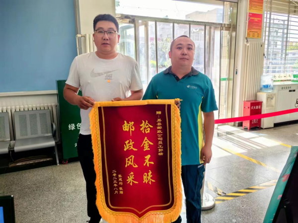 2023年9月13日上午9點,失主張先生來到了易縣郵件處理中心,送來一面寫有“拾金不昧,郵政風采”的錦旗,并拉著快遞員郭瑞同志的手表示感謝,他為郵政人的暖心舉動點贊。