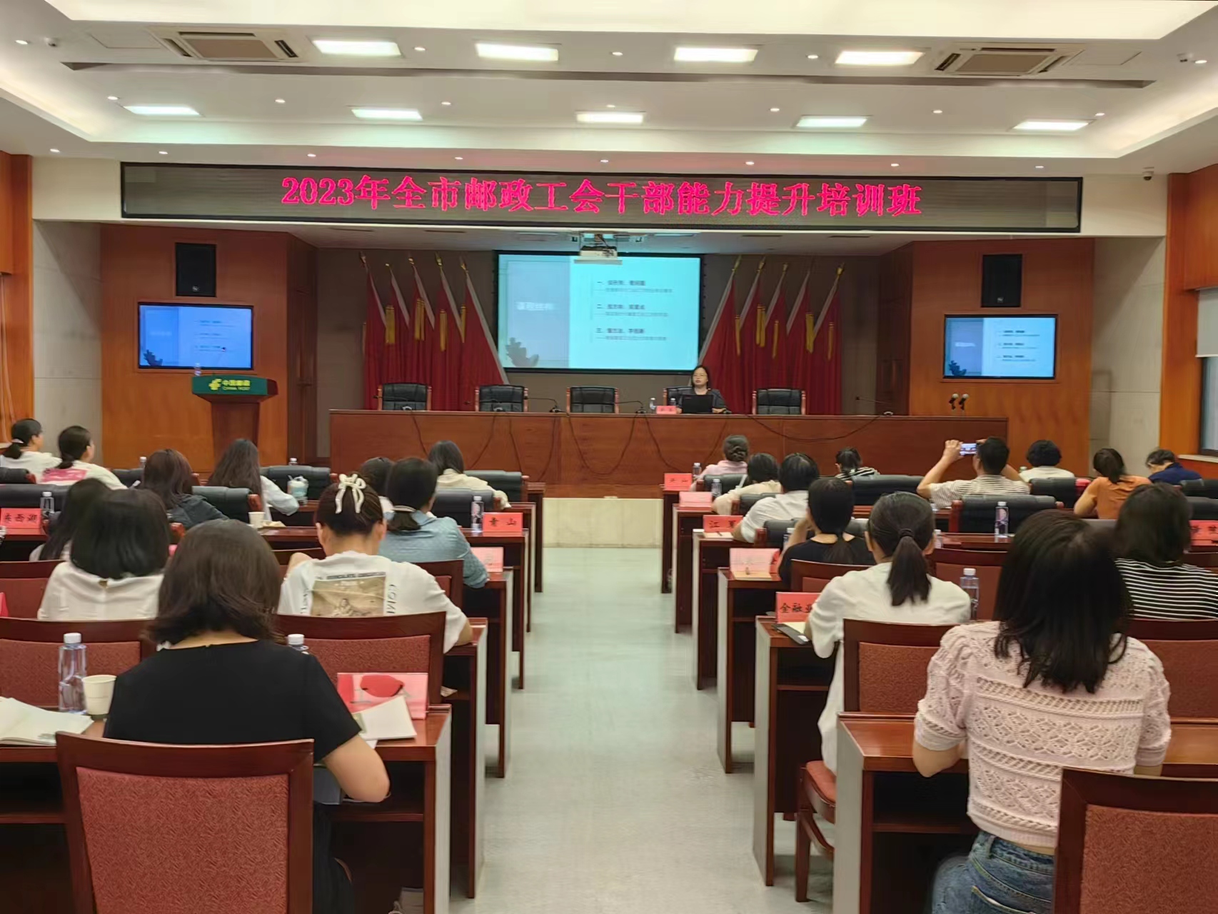 為加強全市郵政工會干部隊伍建設,提高工會干部的思想政治素質和工作能力,9月12日,武漢市郵政工會舉辦了2023年全市郵政工會干部能力提升培訓班。此次培訓旨在學習貫徹落實黨的二十大精神,進一步理清工作思路、找準工作定位、體現工作特色,開創全市郵政工會工作新局面。市郵政工會全體人員、各區分公司辦公室主任、工會干事,市分公司各直屬單位、市寄遞事業部工會干事,市分公司機關工會委員會全體委員,市分公司各部室工會小組長等共50余人參加了本次培訓。