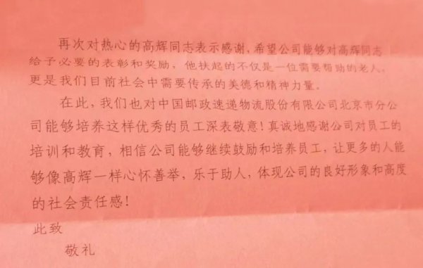 不久之后,高輝就得知李女士寫(xiě)了一封感謝信并郵寄到北京市郵政分公司,感謝他的同時(shí),高度贊揚(yáng)了郵政人高尚的道德情操以及社會(huì)責(zé)任感。“收到感謝信,我很意外、也很欣慰。”高輝說(shuō),自己只是做了一件小事,卻收獲了這份意外的感動(dòng)。