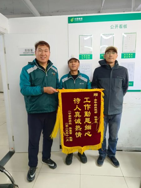 11月20日上午,北京二中朝陽學校張老師來到朝陽區慈云寺郵政支局青年路投遞部。為投遞員陳希亮送來錦旗。