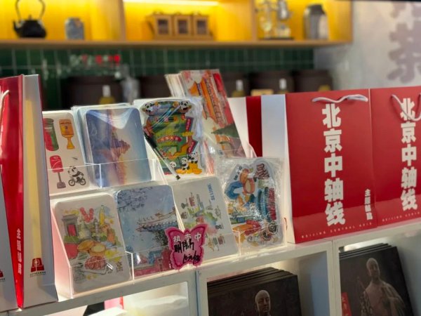 當天開市的北京中軸線主題郵局設于宏恩觀東側,是首家以中軸線為主題的文旅服務主題郵局,是集綜合郵政服務、文創消費、文化交流、展覽展示體驗于一體的“漫步中軸”主題郵政文創綜合服務體。郵局門口擺放的傳統二八自行車和綠色郵筒,營造出濃郁的郵政氛圍,沿著臺階拾級而上,走進主題郵局店內,左邊區域設置了飲品臺,可供游客進來喝一杯暖暖的熱飲。同時多種郵品和文創產品擺滿展區,凸版印刷機和明信片打印機讓大家流連忘返,明信片、鑰匙鏈、冰箱貼、搪瓷缸子等各類產品琳瑯滿目。
