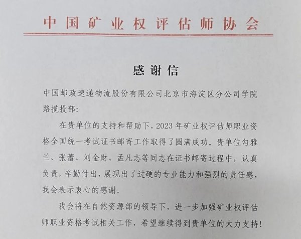 新年伊始,學(xué)院路攬投部全體人員以良好的精神狀態(tài)和飽滿的熱情投入各項(xiàng)工作。與之對應(yīng)的,用戶用感謝信和錦旗給他們的工作打出一百分。“謝謝你們的付出,證書寄遞工作已圓滿收官,為郵政的服務(wù)點(diǎn)贊!”1月10日,中國礦業(yè)權(quán)評估師協(xié)會的崔老師專程來到學(xué)院路攬投部送上感謝信,并表示,由于寄遞的物品比較特殊,學(xué)院路攬投部提供了郵件查詢的延伸服務(wù),寄遞中出現(xiàn)的問題也都得到妥善處理,為2023年礦業(yè)權(quán)評估師職業(yè)資格全國統(tǒng)一考試工作取得圓滿成功提供了有力保障。