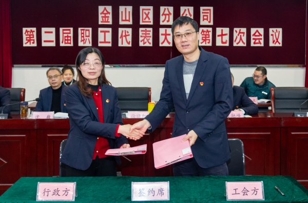 區分公司副總經理(主持工作)徐曉紅代表行政方、區分公司工會主席高杰斌代表工會方共同簽訂了《中國郵政集團有限公司上海市金山區分公司2024年實事項目方案》。