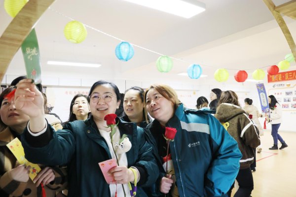 在玫瑰簽名墻上,職工們簽下名字,與玫瑰來了一場浪漫相約,互相拍照留戀,留下洋溢的笑容;撕標(biāo)簽環(huán)節(jié),女性職工們大膽痛快的撕掉標(biāo)簽,對刻板印象說“NO”,做獨(dú)立自信的新時(shí)代巾幗女英雄;最熱鬧的莫過于猜燈謎和投壺納福環(huán)節(jié),職工們紛紛開動頭腦解謎題,躍躍欲試投壺納福,會場一片歡聲笑語;OH卡牌解壓環(huán)節(jié),職工們與心靈進(jìn)行了一場深入交流,通過卡牌,緩解情緒的困擾、工作的壓力,讓心靈得到疏解。活動尾聲之際,大家紛紛合影留戀,讓活動更有意義。