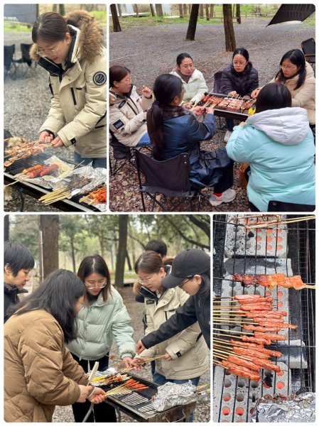 午餐時分,大家來到綠樹成蔭的燒烤區,開始了自助燒烤活動。大家分工合作:有人負責烤串,有人負責調味,還有人忙著幫大伙兒準備餐具和飲料……不多時,香氣四溢的烤串兒陸續出爐,饞得人直流口水。揀一把自己喜歡的串兒,圍爐閑敘,好不悠閑。都道“人間煙火氣,最撫凡人心”,碳火繚繞輕煙,烘烤著一串串的烤串,也溫暖著爐火邊圍坐的大家,驅散早春的料峭寒意。