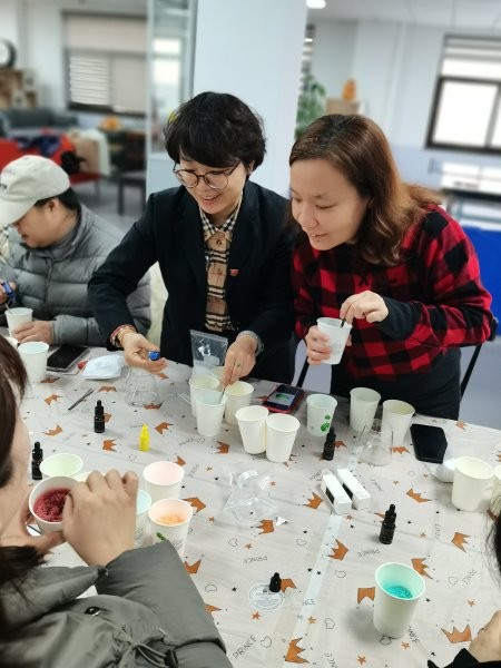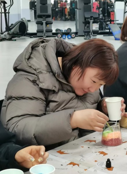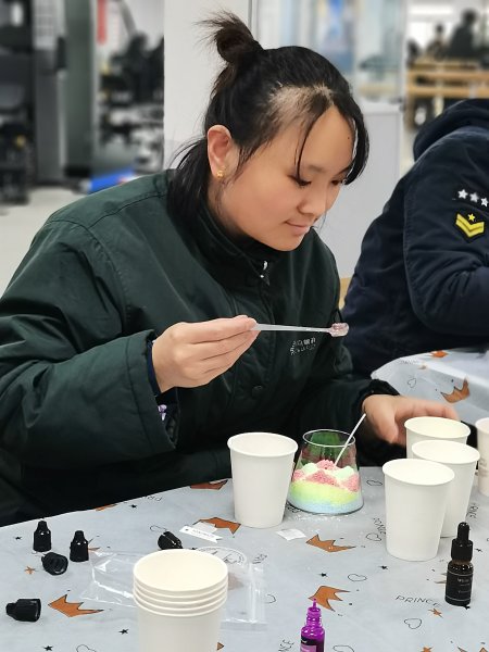 活動現場,老師講述了沙畫、香薰蠟燭的起源與發展,細致講解了香薰蠟燭的制作流程、功效以及注意事項,大家看得津津有味,紛紛摩拳擦掌、躍躍欲試。隨后在老師的指導下,大家各自挑選了自己喜歡的香薰精油,將選好的精油和顏料滴入白沙蠟里不停攪拌,調制出帶有自己喜歡的氣味和顏色的沙蠟,并將不同色彩的沙蠟層層堆疊,組合成自己心中的圖案,經過一個小時的制作,一個個帶有自己創作元素和藝術審美、芬芳濃郁的沙畫蠟燭便制作完成了。