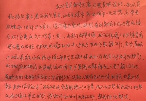 那天,用戶隋阿姨到網(wǎng)點郵寄包裹,物品零碎且重量較沉,龔金鵬一邊指導隋阿姨填寫好單據(jù),一邊快速完成了包裹檢驗和封裝工作。再次核對完郵寄信息后,龔金鵬將單據(jù)交到隋阿姨手中,叮囑其妥善保管。業(yè)務(wù)辦理完沒過多久,隋阿姨又從回家途中折返回網(wǎng)點,原來是她沒有戴花鏡,把電話號碼填錯了,剛才核對時也沒看出來,回家路上才發(fā)現(xiàn)。看到隋阿姨焦急的表情,龔金鵬一直耐心安慰。“阿姨,您別急!包裹還沒寄出,郵寄信息我很快就能幫您改好。”修改完信息后,龔金鵬又與隋阿姨認真核對了一遍,服務(wù)中的種種細節(jié),讓隋阿姨覺得既親切又溫暖。于是,她寫下感謝信,親自送到網(wǎng)點負責人手中,表達自己的感謝之情。