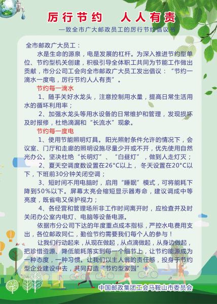 為深入推進節(jié)約型單位、節(jié)約型機關創(chuàng)建,根據(jù)安徽省公司《關于進一步厲行節(jié)約堅持過緊日子的通知》要求,積極引導全體員工共同為節(jié)能工作做出貢獻,馬鞍山政郵工會向全市郵政廣大會員、員工發(fā)出倡議:“節(jié)約一滴水一度電,厲行節(jié)約人人有責”。本次倡議依據(jù)市分公司下達的年度重點成本指標,嚴控水電費用支出,倡導勤儉節(jié)約需要我們每個人的參與,從現(xiàn)在做起,從點滴做起,從身邊做起,把珍惜資源、降低能耗落實到每一個細節(jié)上,讓節(jié)約能源成為一種態(tài)度,一種習慣。讓我們以主人翁的責任感,投身于節(jié)約型企業(yè)建設中去,共同打造“節(jié)約型郵政家園”