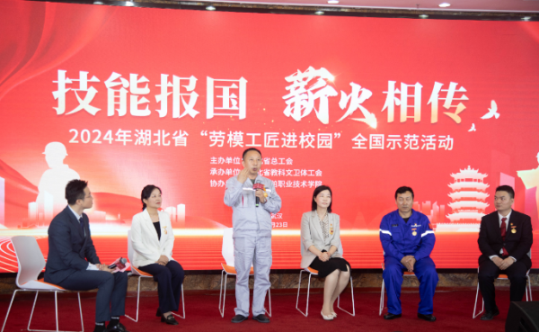 本場宣講活動以“技能報國、薪火相傳”為主題,劉杰與全國勞動模范周怡、王建清,湖北省“十佳師德標兵”汪行,大國工匠周永和共5位勞模工匠一起,被授予兼職導師聘書,與來自武漢船舶職業(yè)技術學院、長江工程職業(yè)技術學院、武漢鐵路職業(yè)技術學院的300名師生代表共聚一堂,分享奮斗故事、暢談勞動心聲,全省各類職業(yè)院校師生同步收看直播。