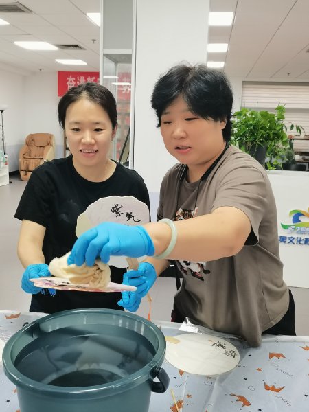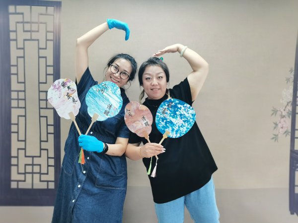 “哇!”“好漂亮!”“還是你的配色好看!”“我這個太成功啦!”每一個扇面出水的瞬間,大家都驚訝于成品的“獨一無二”,大家在欣喜的贊嘆聲中,感受著中國傳統美學的詩情畫意。