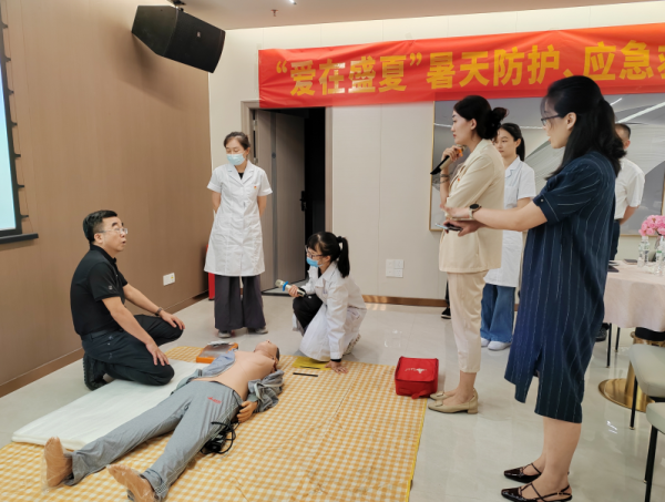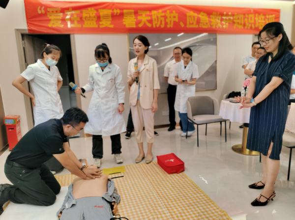 培訓(xùn)中,授課老師從暑天防護(hù)、中暑的不同癥狀表現(xiàn)及應(yīng)對處理、突發(fā)狀況應(yīng)急搶救、AED使用等方面進(jìn)行了詳細(xì)講解和實(shí)操培訓(xùn)。員工們踴躍上臺體驗(yàn),按觀察環(huán)境、確認(rèn)體征、指揮呼叫、打開氣道、定位按壓、輔助吹氣、AED操作等“黃金四分鐘”流程依次演練,并積極與老師進(jìn)行互動交流。