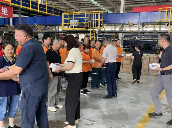 7月15日14:30長沙郵區中心黨委書記彭卓立、工會主席劉毅帶領綜合辦、工會來到生產一線開展高溫慰問活動,向員工發放霍香正氣水、人丹等防暑降溫物品。卓立總親切與車間員工交談,了解一線職工的防暑需求,叮囑大家在高溫作業下注意自身防護,確保生產安全。