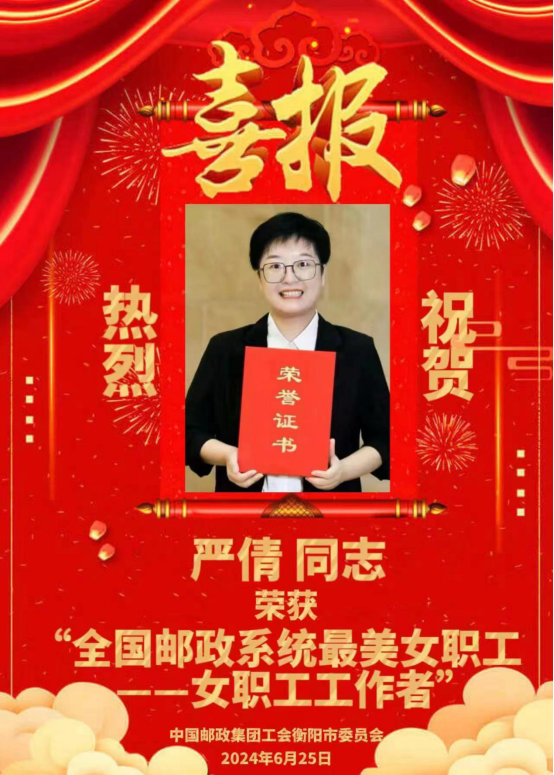 6月25日召開(kāi)的中國(guó)郵政集團(tuán)工會(huì)女職工委員會(huì)三屆一次全委(擴(kuò)大)會(huì)議,授予32名女職工工作者“全國(guó)郵政系統(tǒng)最美女職工工作者”榮譽(yù)稱(chēng)號(hào),衡陽(yáng)市郵政分公司女工委主任嚴(yán)倩榜上有名,為湖南郵政系統(tǒng)唯一獲此榮譽(yù)的女職工工作者。