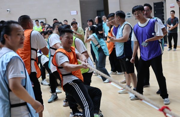 最后兩個(gè)項(xiàng)目:“紙杯接力”“拔河比賽”為郵銀對(duì)抗賽,接力賽中運(yùn)動(dòng)員們或?qū)WB杯,或奮力奔跑,隊(duì)員們團(tuán)結(jié)一致,全情投入。重頭戲“拔河比賽”,將整場(chǎng)運(yùn)動(dòng)會(huì)氣氛推向高潮,雙方各派出最強(qiáng)健的運(yùn)動(dòng)員,大家蓄勢(shì)待發(fā),扎穩(wěn)腳步,“起繩,拉緊,預(yù)備,開始”,隨著裁判員的一聲令下,參賽隊(duì)伍劍拔弩張,參賽隊(duì)員個(gè)個(gè)顯示出力拔山兮氣蓋世的英雄豪邁。隊(duì)員們氣勢(shì)如虹,他們身體后仰,重心后壓,其專業(yè)的動(dòng)作、一致的步伐、整齊的口號(hào),讓現(xiàn)場(chǎng)的每一位觀眾看得心潮澎湃,都為參賽隊(duì)員加油鼓勁。