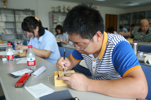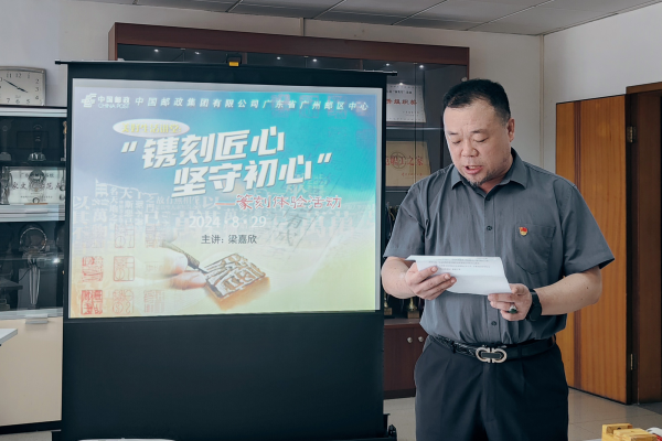 活動伊始,廣州郵區中心工會副主席高東林作了熱情洋溢的致辭。他表示:“在這個快節奏的時代,我們往往容易忽略那些需要耐心與專注才能成就的美好。今天,我們相聚在這里,通過篆刻這一古老而又充滿智慧的藝術形式,不僅是要體驗一種技藝的傳承,更重要的是要學習那份‘鐫刻匠心,堅守初心’的精神。希望每一位參與者都能從篆刻的每一刀、每一劃中,感悟到對工作的執著與熱愛,對生活的細膩與溫情?!?/p>