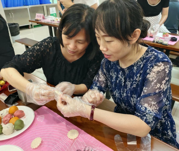 大家根據自己的口味和喜好,挑選了新鮮豐富的食材餡料,將它們裹入晶瑩剔透的軟糯冰皮中,并用模具壓制成型,在餅面印上精美的花紋圖案,制作出了精致美味的冰皮月餅。