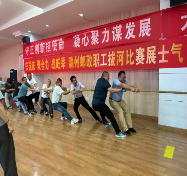 為慶祝迎接國慶七十五周年的到來,進一步增強企業凝聚力,培養企業職工團結協作精神,為了迎接旺季業務的來臨,提高職工身體素質、健康水平,不斷豐富職工業余文體活動,9月20日下午,滁州市郵政工會在工會五樓多功能廳組織開展“慶國慶、聚合力、站旺季”職工拔河比賽活動。市本部各部門90余人參加比賽。 參賽選手們精神飽滿、斗志昂揚,哨聲響起后全體隊員提起氣勢、鉚足干勁,雙手緊握繩索,雙腳釘穩地面,繩索中心的紅結忽左忽右,圍觀觀眾呼聲陣陣、掌聲雷鳴,比賽現場人頭攢動,氣氛異常熱烈。經過3輪近11場次激烈較量,金融業務部、城區分公司、寄遞業務部獲得女子組前三名,渠道業務部、寄遞業務部、城區營業部獲得男子組前三名。活動結束后職工們紛紛表示:“這樣的活動讓我們既放松了心情,也鍛煉了身體,希望工會以后能多開展此類活動。”