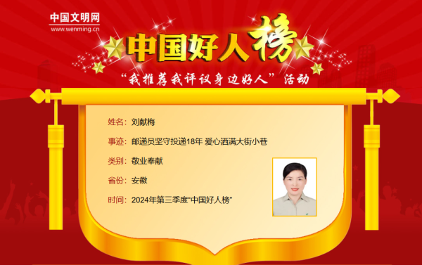 2024年第三季度“中國好人榜”阜陽郵政投遞員劉獻梅上榜獲評敬業(yè)奉獻類好人。劉獻梅,中國郵政集團有限公司阜陽市分公司投遞員。從事投遞工作18年來,劉獻梅每天的投遞路線長達50公里,投遞的報刊達80多種,重達50公斤,每天投遞兩次,創(chuàng)建“愛心郵路”7條,義務(wù)服務(wù)9位老人。18年投遞路,劉獻梅在平凡崗位上默默堅守,把每一封信件、每一份報刊,準(zhǔn)時準(zhǔn)確送達用戶手中,獲得了用戶和周邊居民的認(rèn)可和好評。劉獻梅曾榮獲全國五一勞動獎?wù)隆不帐趧幽7丁不帐∴]政優(yōu)秀投遞員等榮譽。