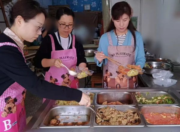 當攬投員風塵仆仆返回單位,工會慰問組已在食堂準備好午餐。她們戴上圍裙,熟練地拿起餐盒和勺子,變身為配餐員,細心地為每一份餐盒裝飯和菜,紅燒肉圓、醇香雞腿、清炒時蔬、熱騰騰的米飯……每一份餐都分量十足、營養均衡,承載著滿滿的關懷。