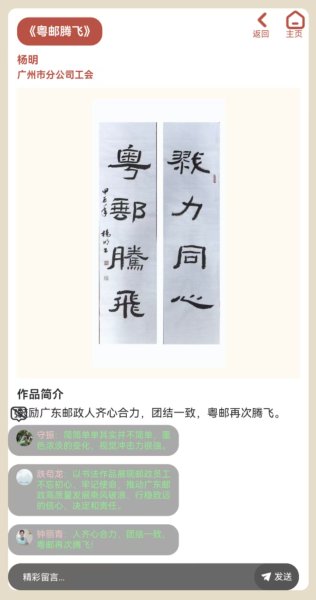 活動(dòng)自開展以來,便受到了員工們的廣泛關(guān)注和積極響應(yīng)。據(jù)統(tǒng)計(jì),線上巡展上線僅3日,累計(jì)瀏覽人數(shù)突破1.5萬(wàn)人次。截至日前,員工評(píng)論數(shù)超過480條。與此同時(shí),省郵政工會(huì)推出郵政文化元素系列宣傳海報(bào),進(jìn)一步擴(kuò)大了活動(dòng)的覆蓋面,基層市縣區(qū)鎮(zhèn)一線員工均可在工余飯后放松欣賞郵苑書畫展。