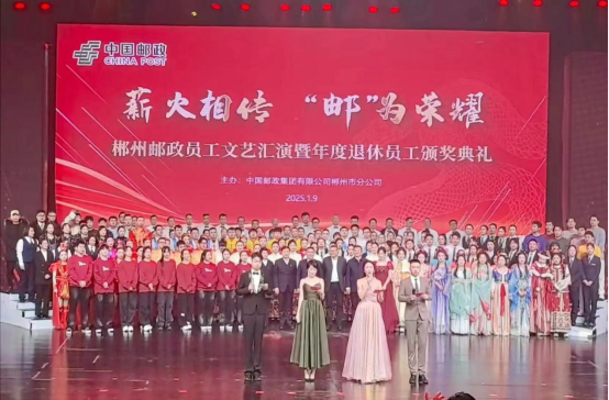 1月9日晚,郴州郵政員工文藝匯演暨年度退休員工頒獎典禮在郴州市廣電中心隆重舉行,文藝匯演由市機關及11個區縣分公司選送,2024年度退休的22位員工代表蒞臨現場并被授予銀質獎章。晚會現場還邀請了郴州市總工會黨組書記、喻棉秀以及郴州市移動、聯通、電信、鐵塔以及郵儲銀行的主要負責人。