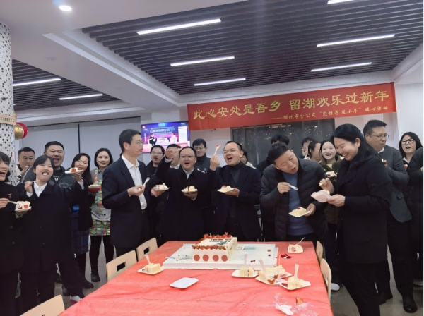 活動現場“切蛋糕 步步高”的環節,湖州市分公司領導們一起把切好的蛋糕分發給在場的每一個人,大家一起品嘗著這份甜蜜。在這一刻,大家共同許下了美好的心愿,祝福湖州郵政2025“新躍升”的關鍵年乘風破浪、再上新臺階!