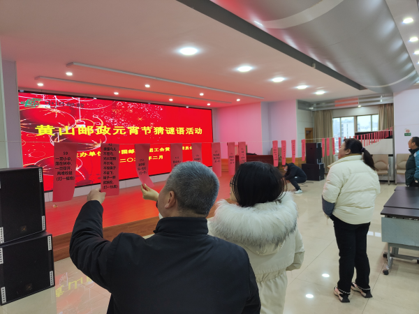 在元宵節來臨之際,為營造喜慶歡樂的節日氛圍,增強郵政員工的凝聚力,2月11日下午,黃山郵政組織開展慶元宵節猜謎語活動。 活動現場以熱鬧的大紅色調為主,紅紅的謎面條幅整齊懸掛,營造出良好的節日氣氛。此次活動中謎面內容豐富,難易結合,謎底涵蓋成語、植物、動物及古詩詞等。兌獎區里前來兌獎的郵政員工絡繹不絕。“知道工會組織了猜謎語活動,早早的就來參加了,一來是工作之余放松一下心情,二來是感受傳統節日的氛圍,還找到了兒時過節的感覺。”一位兌換到獎品的郵政員工說。 大家紛紛表示,此次猜謎語活動既能益智健腦,又讓大家感受到了中國傳統文化的魅力,也為黃山郵政精神文化建設增添了新的色彩。
