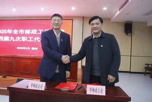 會議期間,王健作為企業方代表,工會主席肖翔作為員工方代表,分別簽訂了《贛州市分公司2025年為員工辦實事承諾書》和《贛州市分公司工資集體協商專項協議》,王健與縣分公司代表簽訂了 2025 年度贛州郵政平安建設責任狀。(江西省郵政工會)
