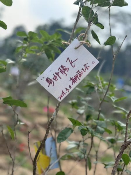 植樹現場,80多名本部員工分工有序,兩三人一組,揮鍬鏟土、扶苗培土、踩實澆水,每一個步驟都凝聚著大家對環境保護的責任感和對綠色未來的期待。一片歡聲笑語中,50棵桂花樹傲然挺立,它們不僅承載著生命的希望,更寄托著員工們的美好祝愿。每棵樹苗上都掛上了精心準備的心愿卡,字里行間滿是對小樹苗茁壯成長的殷切期盼。