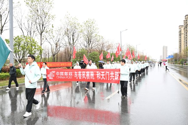 3月28日,2025年天門市春季萬人8公里健康跑在竟陵街道黨工委北湖大道如期開跑。天門市郵政分公司跑團50名隊員身著統(tǒng)一服裝,手擎中國郵政大旗與企業(yè)文化方塊旗和“與春風(fēng)賽跑、和天門共躍”的健康跑活動主題橫幅,在綿綿春雨中邁著歡快矯健的步伐,用腳步丈量城市,用汗水澆灌健康,在運動健身的同時盡享北湖美景,成為活動現(xiàn)場靚麗的流動綠色風(fēng)景線。