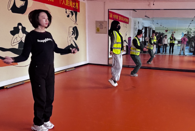 隨著裁判的一聲令下,選手們迅速進入狀態,手中的跳繩如飛舞的彩帶,在空中劃出一道道優美的弧線。有的選手動作輕盈,跳繩的速度快得讓人眼花繚亂;有的選手則節奏穩健,展現出扎實的基本功。場邊的觀眾們也毫不吝嗇自己的掌聲和加油聲,為每一位參賽選手鼓勁助威,活動現場洋溢著歡快而熱烈的氛圍。