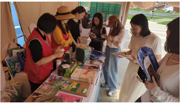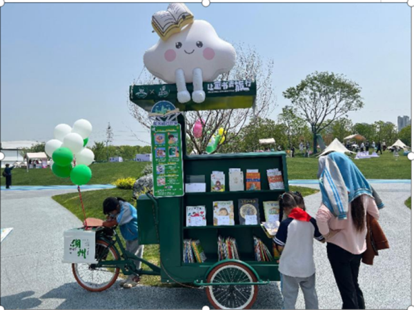 活動現場,小梅港體育公園被裝扮得書香四溢,處處洋溢著閱讀的氛圍。湖州市公共圖書館精心策劃了一系列豐富多彩的活動議程,吸引了眾多市民駐足參與。而在這場文化盛宴中,湖州市郵政公司在書潮市集區設立特色攤位,不僅為閱讀者提供了涵蓋文學、社科、少兒讀物等多品類書籍,并推出郵政“童書漂流車”創新服務,鼓勵孩子們交換圖書,傳遞知識與快樂。成為現場一道亮麗的打卡風景,吸引眾多閱讀愛好者駐足參與。