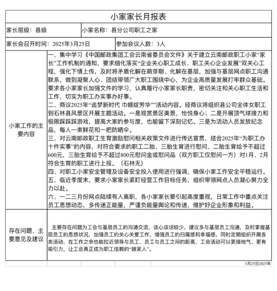 為發揮好工會組織作為黨聯系職工群眾橋梁紐帶的作用,云南郵政工會創新開展職工小家“家長”工作,并逐步明確省、州市、區縣、職工小家四級“家長”工作職責,完善聯動應答、長效調研、信息交流、考評激勵四項工作機制,并重點搭建了“基層直通車”職工意見建議收集反饋的線上平臺,暢通職工合理化意見建議及訴求渠道。日前,云南郵政工會以線上會議的方式,首次召開省級“家長”會,通報了全省一季度“基層直通車”職工意見建議處理情況、小家“家長”月報收集情況,組織曲靖、紅河兩家單位進行經驗交流分享。