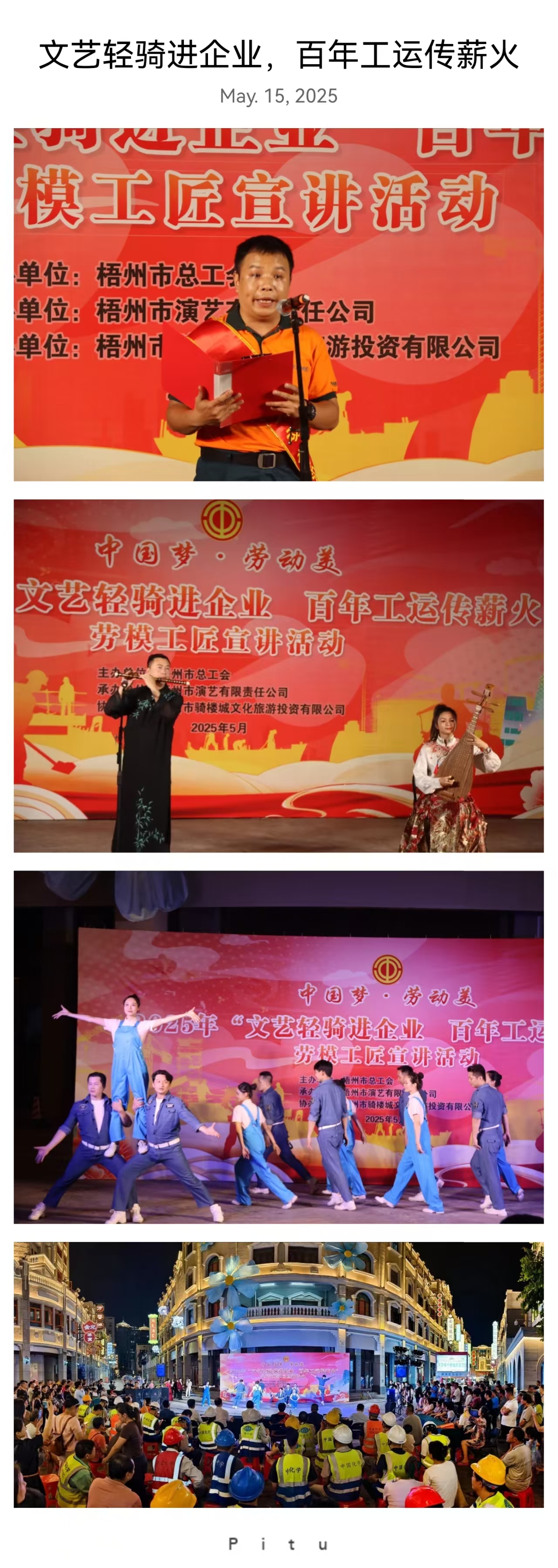 5月14日晚上,由梧州市總工會主辦的“文藝輕騎進企業百年工運傳薪火”勞模工匠宣講活動在梧州騎樓城舉行,梧州郵政朱哲作為2025年全國勞動模范代表并參與宣講。