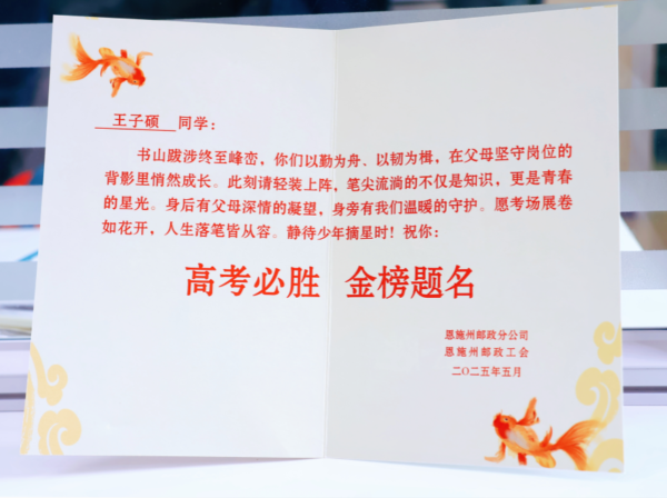 5月30日,恩施州郵政工會(huì)組織各縣市郵政工會(huì)開展了一場(chǎng)溫情滿滿的考前慰問(wèn)活動(dòng),向全州即將踏上高考考場(chǎng)的43名郵政職工子女傳遞了組織的關(guān)懷與力量。