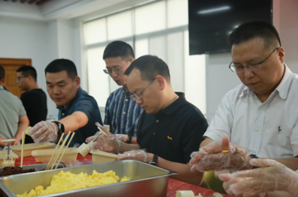 在綠豆糕制作區,盤里的綠豆粉在年輕人掌心漸漸揉成光滑的圓球。“這是要做爆漿款嗎?”包餡時偶爾溢出的豆沙讓大家趣笑不已。當公司領導挽起袖子加入時,現場響起歡呼聲,平日里嚴謹的管理者,此刻正專注地與大學生們比試著“壓模”手法。湖州市分公司總經理章如權笑著展示自己壓模成功的綠豆糕說:“做這個就像為客戶做資產配置一樣,餡料比例一定要精準”,一句職場金句引發了大家的歡笑。此刻,領導與員工已不再是上下級,而是共同制作甜點的“家人”。