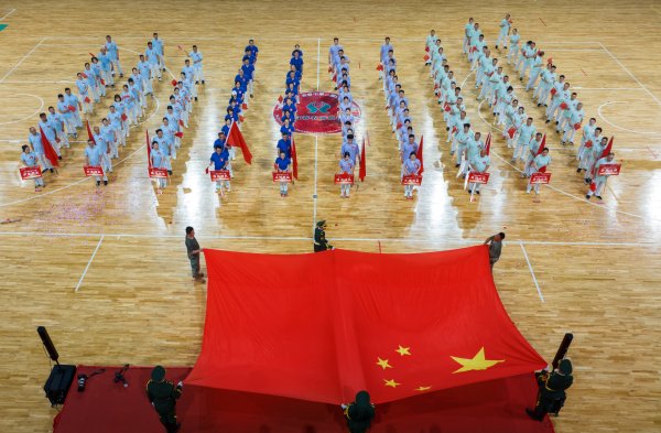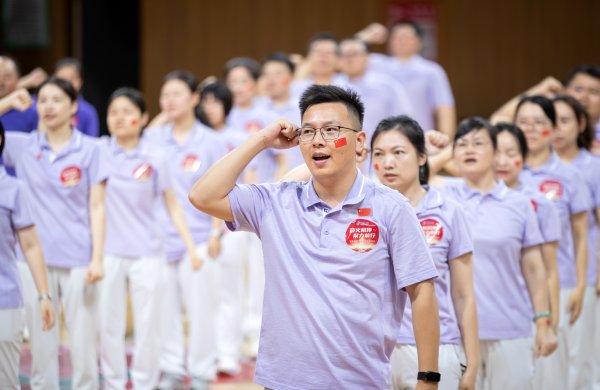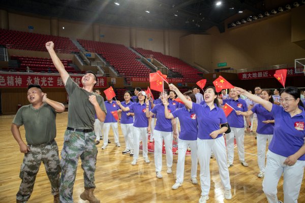 莊嚴的國歌響起,大家注視著國旗,唱響國歌,心中涌動愛國的熱情。國旗引領,旌旗飄揚。各戰隊旗手揮動手中的紅旗,列隊奔跑,搖旗吶喊,一面巨幅國旗越過方陣來到前場,將迎旗儀式推向了高潮。