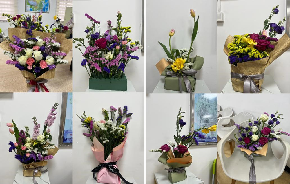 在無模板的創作氛圍下,參與者們創意頻出。有人用筒狀包裝紙固定花束,搭配彩帶;有人用褶皺紙、絲帶流蘇裝點花莖。普通材料經他們巧手改造,重煥生機。不同花卉相互映襯,作品營造出浪漫氛圍,傳遞著積極情緒。工會工作人員用鏡頭記錄下大家專注創作與交流的場景,彰顯出他們在藝術創作中的才華與團隊協作精神。