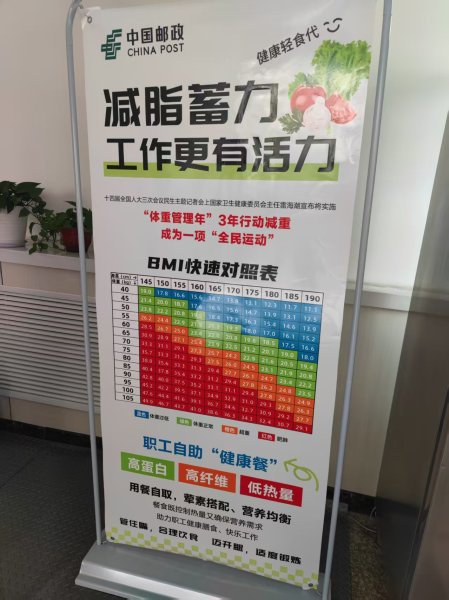 為了配合本次活動,本溪郵政工會在食堂立BMI快速對照表宣傳版,讓職工們及時了解自己的身體狀況。同時食堂每天中午特別為職工提供減脂餐,每天的減脂餐都不重樣。雞胸肉、蔬菜、糙米飯等。合理搭配減脂餐,既讓職工吃飽也要保證職工營養攝入。