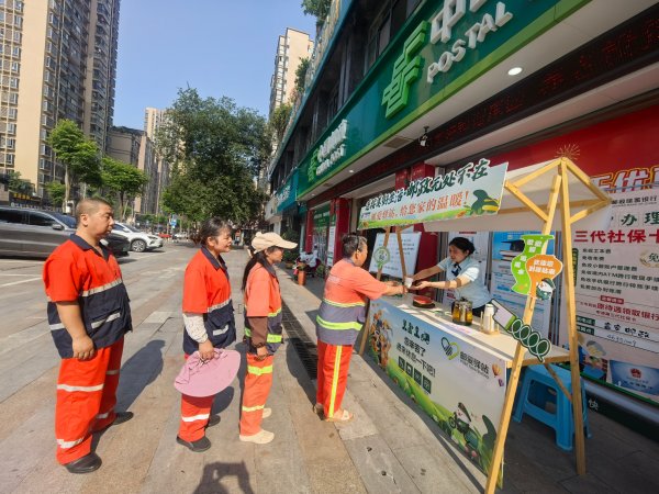 8月15日,榮昌郵政工會(huì)組織開展“郵愛驛站送清涼,真情服務(wù)暖人心”活動(dòng)。總經(jīng)理朱軍帶隊(duì)為環(huán)衛(wèi)工、快遞員、外賣人員、交巡警等戶外勞動(dòng)者送去防暑物資,用實(shí)際行動(dòng)為酷暑中的堅(jiān)守者撐起 “遮陽(yáng)傘”。