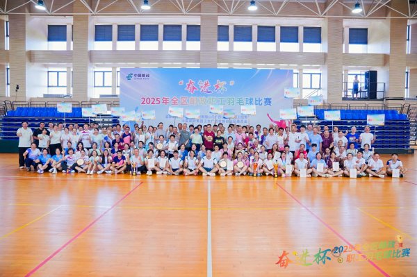 8月28日至30日由中國郵政集團有限公司廣西區分公司、中國郵政集團工會廣西壯族自治區委員會聯合主辦的“奮進杯”2025年全區郵政系統職工羽毛球比賽在南寧鐵道大飯店體育館圓滿收官。開幕式上,區分公司黨委委員、紀委書記黨育致辭并宣布比賽開幕。閉幕式上,區分公司黨委委員、副總經理、工會主席李鳳婷為比賽獲獎代表隊和運動員頒獎。