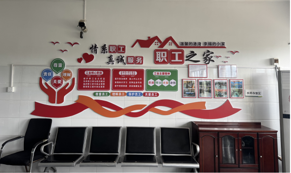 四是立足特色,堅持元素凸顯“有歸屬”。在“陣地”上將工會標識懸掛外墻,強化“家”的辨識度和職工的歸屬感。內部精心設計的宣傳展示板(政策文件、集體榮譽、職工風采、文明公約)以及滾動播放工會宣傳片、培訓課程、勞模工匠事跡、政策解讀的移動電視,在空間營造“有歸屬”方面凸顯工會元素,展現了濃厚的企業文化氛圍,讓職工直觀感受到“家”的精神內核和工會作為,增強了認同感。