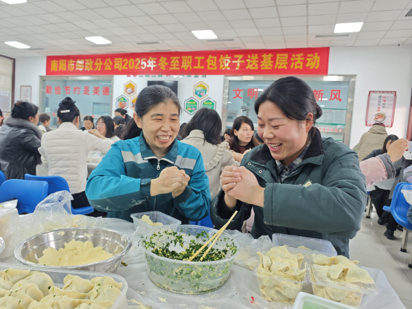 12月19日(星期五)下午3時(shí),市分公司本部及臥龍、宛城兩區(qū)的員工代表齊聚一堂、親手包制餃子,在協(xié)作互動(dòng)中體驗(yàn)傳統(tǒng)飲食文化的樂趣,分享勞動(dòng)與創(chuàng)造的喜悅。為共享節(jié)慶氛圍,市分公司還分別把餃子送往市區(qū)各基層網(wǎng)點(diǎn)和攬投部,讓奮戰(zhàn)在一線、無法親臨活動(dòng)現(xiàn)場(chǎng)的員工也能在冬至?xí)r節(jié)吃上熱氣騰騰的餃子,切實(shí)傳遞市分公司黨委和工會(huì)組織對(duì)基層職工的掛念與關(guān)愛。