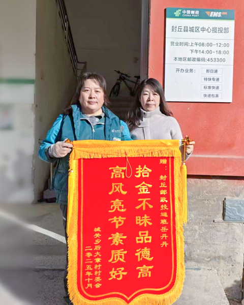 近日,河南省新鄉市封丘縣城關鄉后大章村的村民彭大娘和村委委員一起,來到了封丘縣郵政分公司城區中心攬投部,要當面感謝攬投員岳丹丹。不巧的是岳丹丹正在段道上投遞,二人就將一面寫有“拾金不昧品德高,高風亮節素質好”的錦旗交給了攬投部內務人員。彭大娘還再三叮囑說,一定要把錦旗交給岳丹丹。