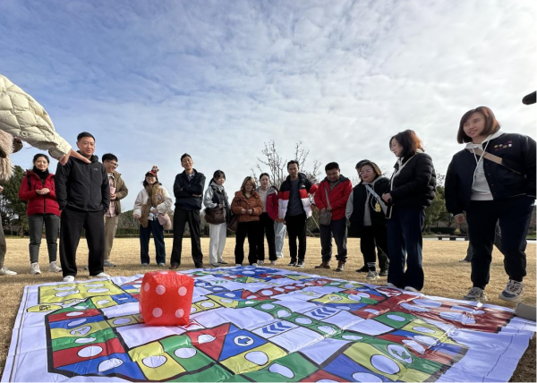 上午在大草坪上進(jìn)行創(chuàng)意十足的“真人飛行棋大挑戰(zhàn)”,全體人員隨機(jī)分為四個(gè)戰(zhàn)隊(duì),每隊(duì)5人,化身為棋盤上的“棋子”。比賽過(guò)程中,隊(duì)員們需共同謀劃、接力完成趣味任務(wù),在巨型棋盤上展開(kāi)智力與運(yùn)氣的較量。現(xiàn)場(chǎng)氣氛緊張熱烈又充滿歡樂(lè),奔跑的身影、專注的討論、成功的歡呼此起彼伏。
