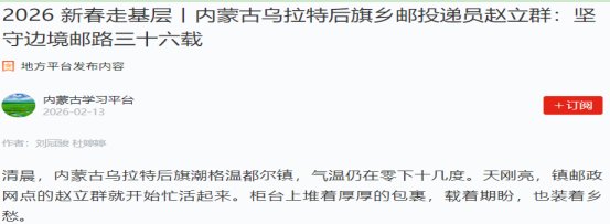 趙立群是內(nèi)蒙古烏拉特后旗鄉(xiāng)郵投遞員。近日,關(guān)于他的先進(jìn)事跡《2026 新春走基層—-內(nèi)蒙古烏拉特后旗鄉(xiāng)郵投遞員趙立群:堅(jiān)守邊境郵路三十六載》報(bào)道在“學(xué)習(xí)強(qiáng)國”內(nèi)蒙古地方平臺刊發(fā)。