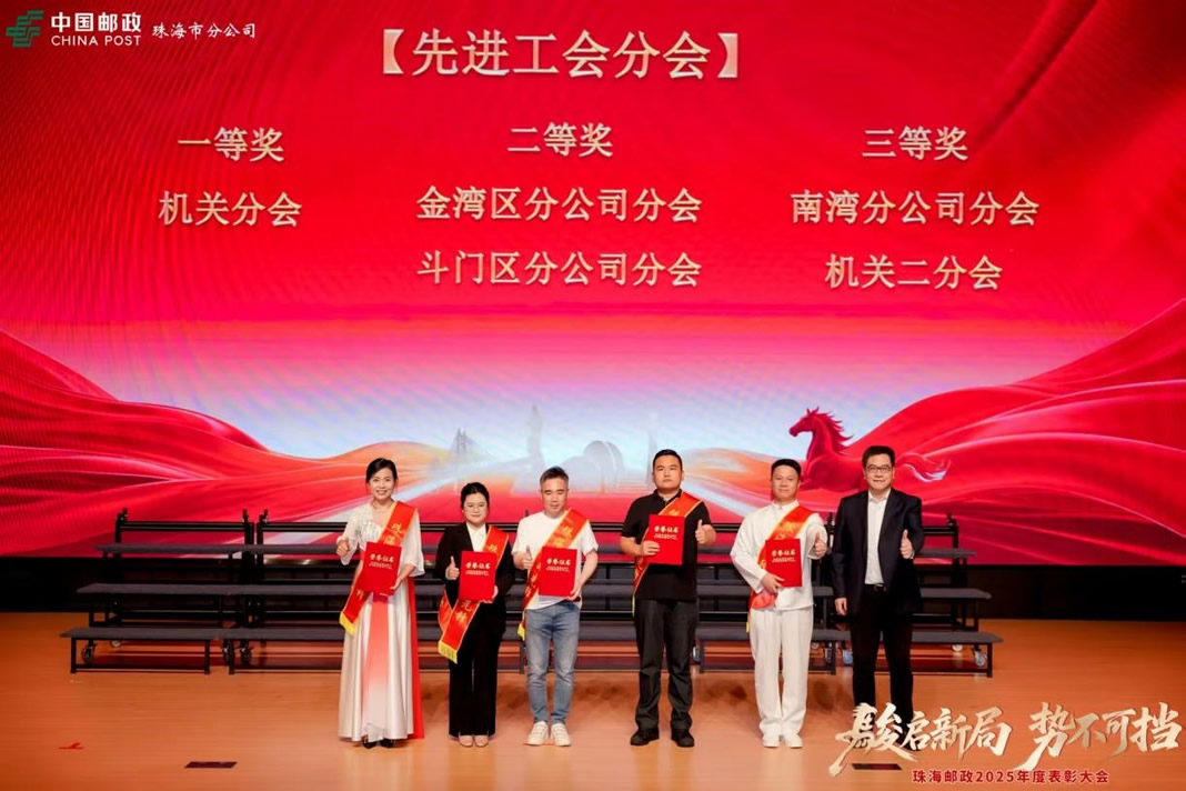 2月10日晚,伴隨著雄壯激昂的開場鼓聲,珠海郵政2025年度先進(jìn)表彰頒獎晚會在珠海市工人文化宮隆重舉行。珠海市分公司黨委書記、總經(jīng)理朱平,副總經(jīng)理兼工會主席李 敏等黨政領(lǐng)導(dǎo)班子全體成員出席會議,并為2025年度先進(jìn)單位、先進(jìn)個人及先進(jìn)工會組織、優(yōu)秀工會工作者逐一頒發(fā)獎狀。