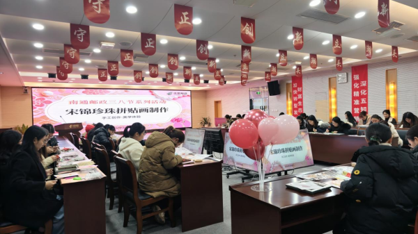 3月6日下午,宋錦珍珠拼貼畫制作活動率先拉開帷幕,60多名女職工齊聚一堂,開啟了一場兼具美感、治愈感與手工樂趣的非遺體驗(yàn)之旅。宋錦,作為中國“四大名錦”之一,其紋樣精致、色彩典雅,承載著千年非遺的深厚底蘊(yùn);珍珠的瑩潤光澤與宋錦的雅致紋理交相輝映,碰撞出獨(dú)特的藝術(shù)火花。女職工們從設(shè)計(jì)構(gòu)圖開始,小心翼翼地用鑷子將一顆顆小巧的珍珠,依循畫稿黏合在精美的宋錦底布上,整個過程寧靜而溫馨,大家相互交流技巧、彼此鼓勵打氣,在專注創(chuàng)作中釋放工作壓力。歷經(jīng)兩個多小時(shí)的精心雕琢,一幅幅獨(dú)具匠心的宋錦珍珠拼貼畫漸次成型,每一幅作品皆傾注了女職工的巧思與心血,不僅讓大家領(lǐng)略到傳統(tǒng)非遺工藝的獨(dú)特魅力,更在親自動手實(shí)踐中收獲了滿滿的成就感與幸福感,陶冶了情操,愉悅了身心。
