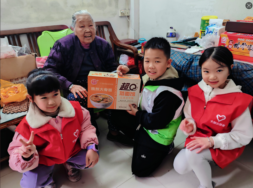 托管期間,多項公益實踐活動同步開展。春節前夕,東莞郵政工會聯合大朗鎮團委、鎮總工會、大井頭村委會,走進大井頭村開展“金暉助老”春節獨居長者關愛行動。20名孩子化身小小志愿者,為社區60位獨居老人送上慰問品與新春祝福,入戶探訪、貼心陪伴,用童真與溫暖為老人們帶去節日關懷。